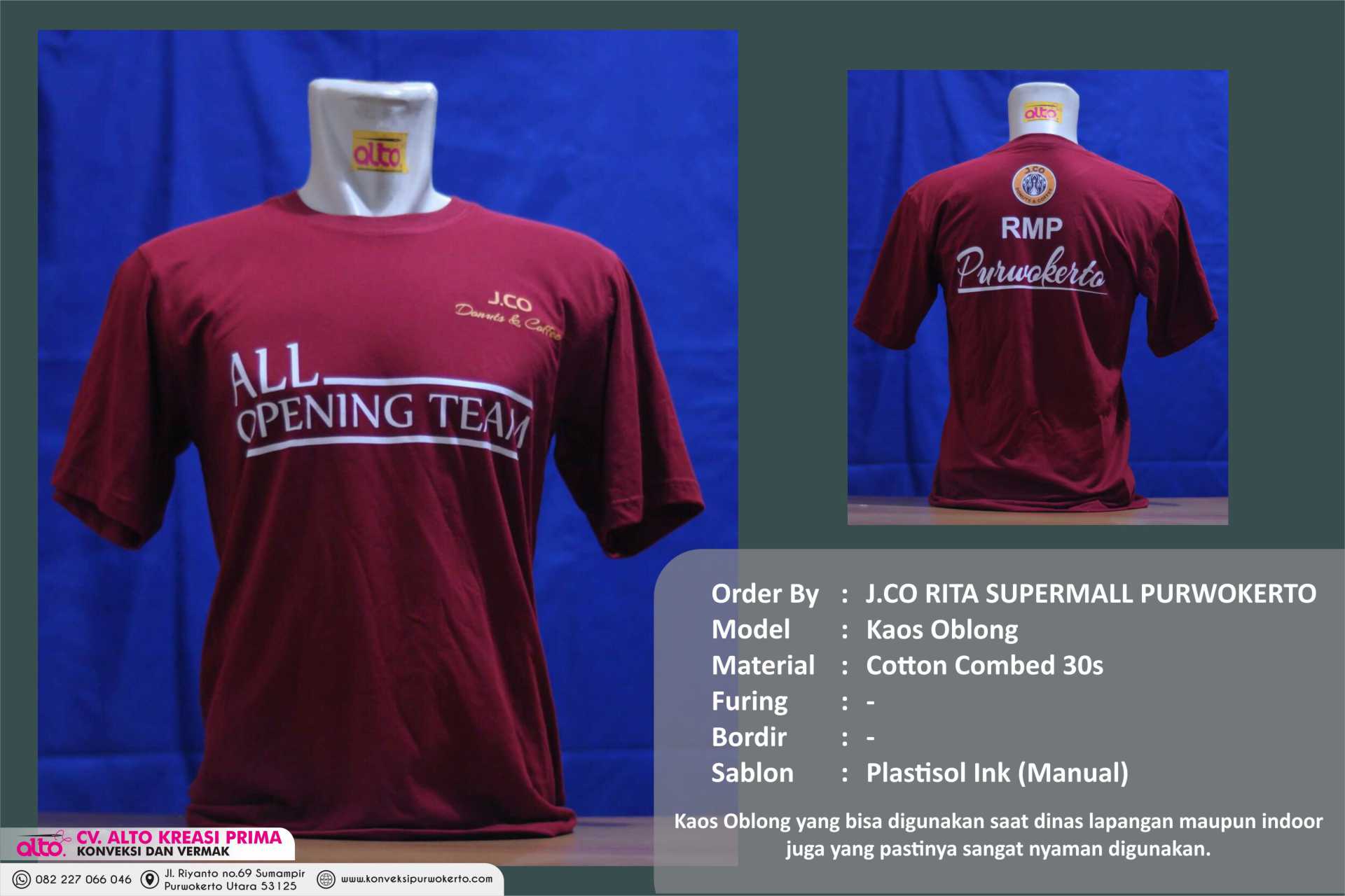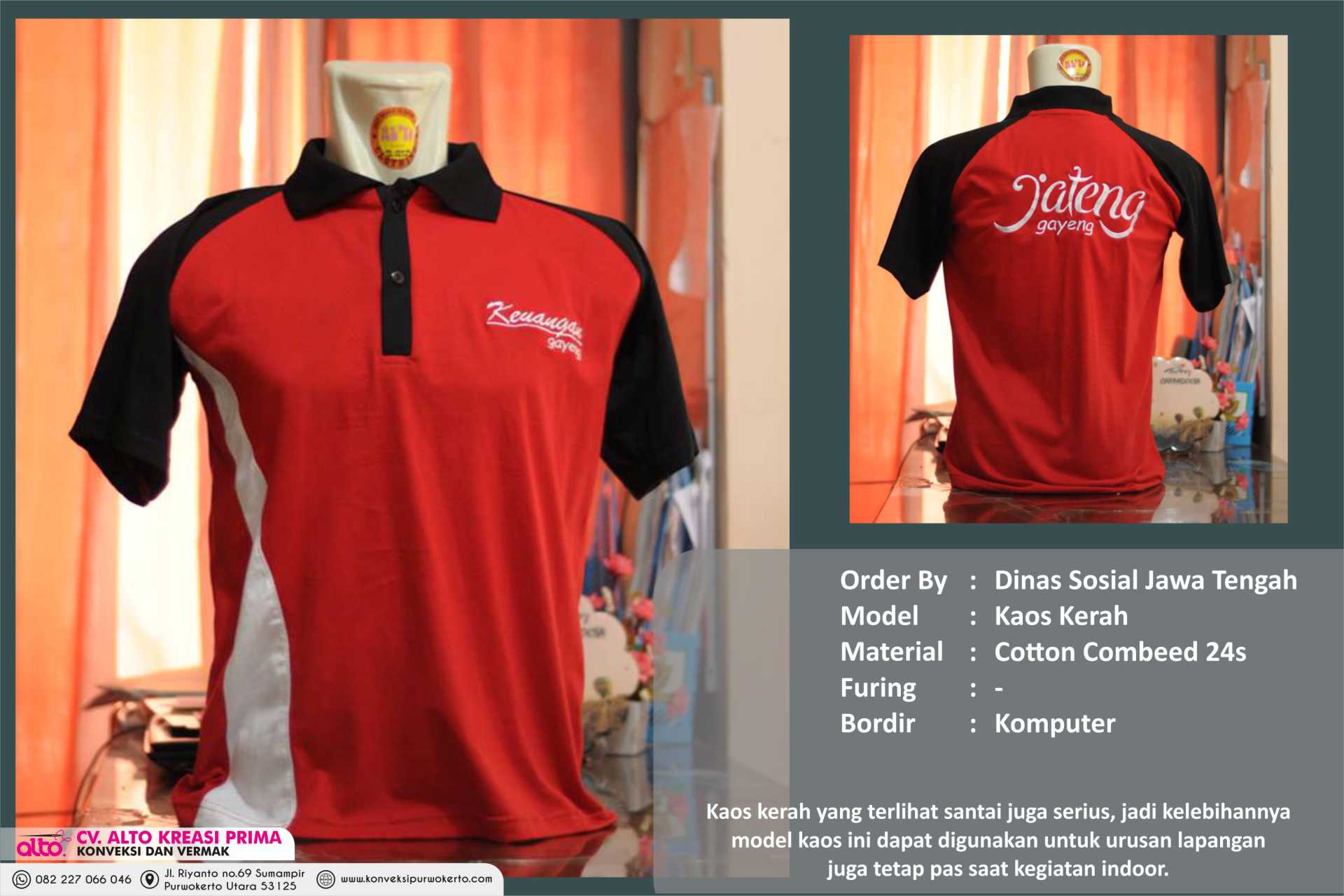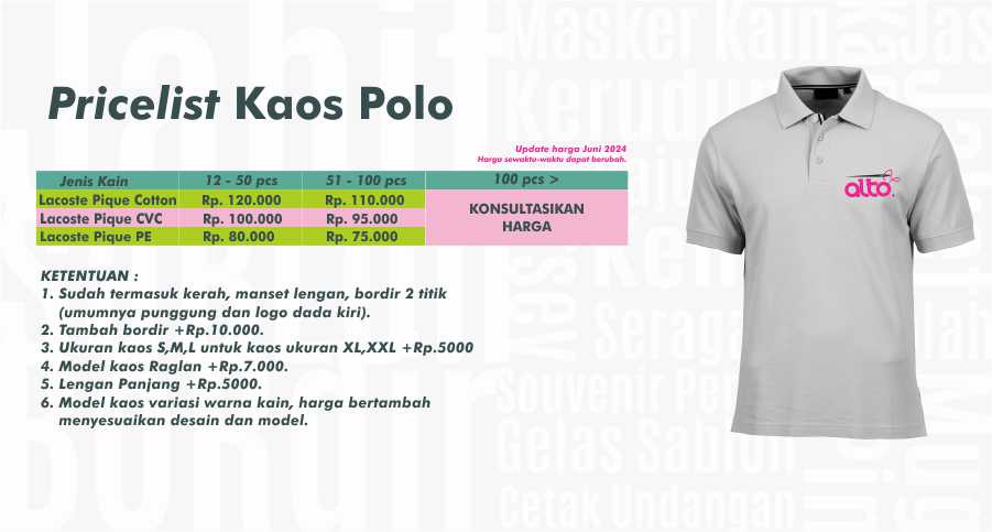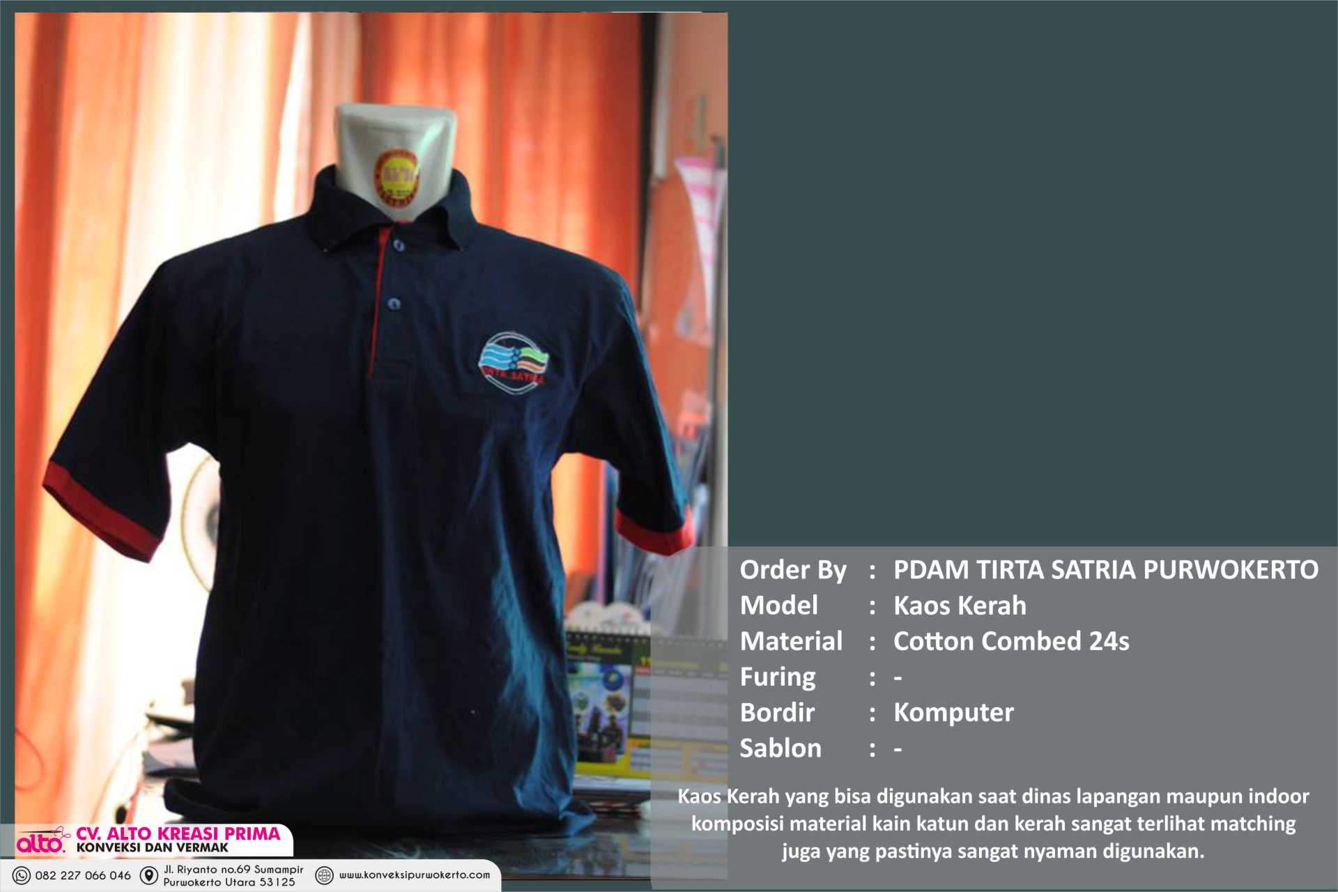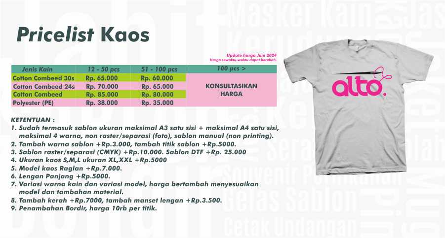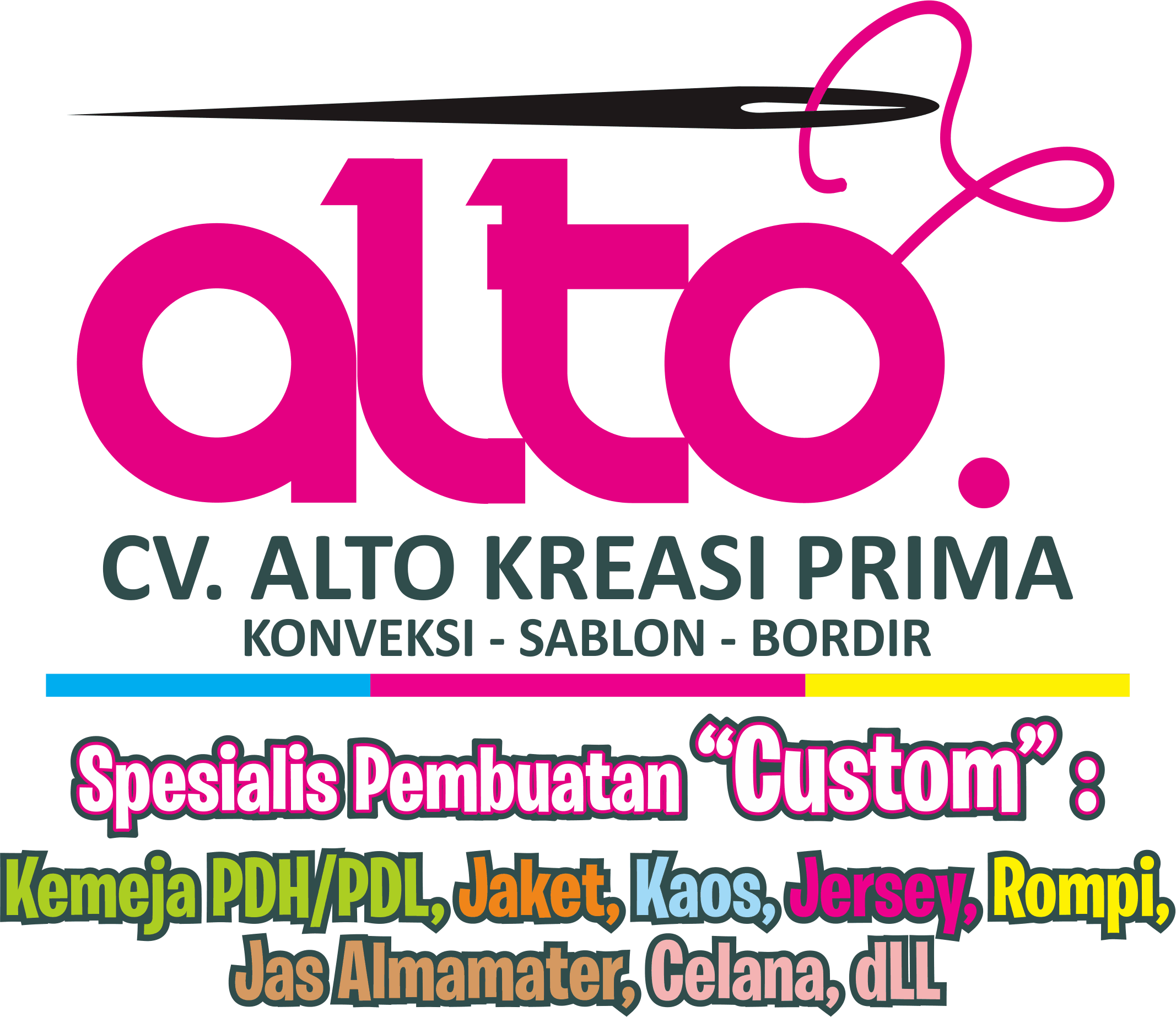 CV. ALTO KREASI PRIMA adalah perusahaan yang bergerak dibidang jasa khususnya jasa Konveksi sablon dan bordir , atas kepercayaan dari konsumen yang masih bekerjasama dengan kami seperti instansi pemerintah, perusahaan swasta, sekolah, maupun individual. Kami sangat menjaga dalam hal kualitas dan ketepatan waktu.