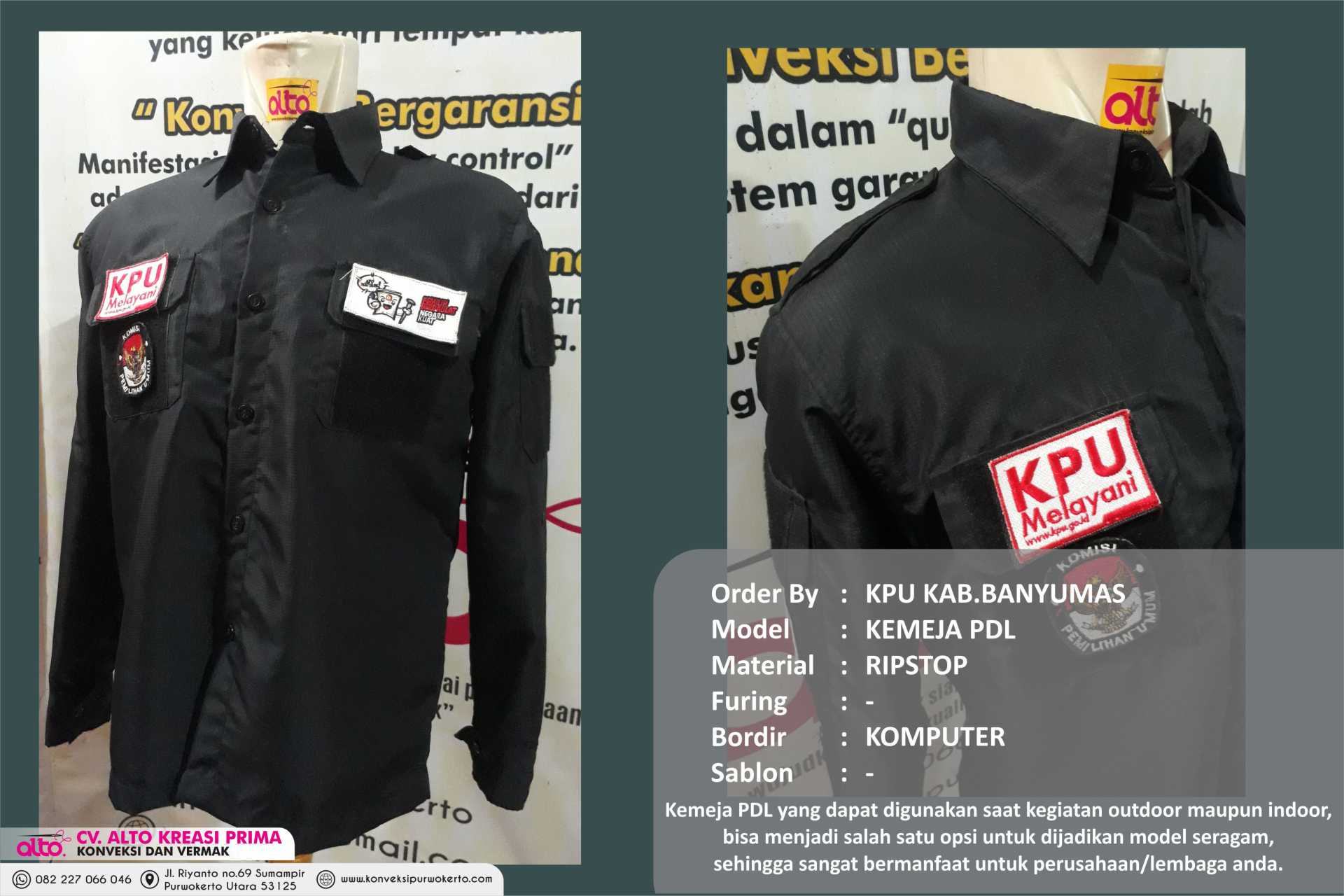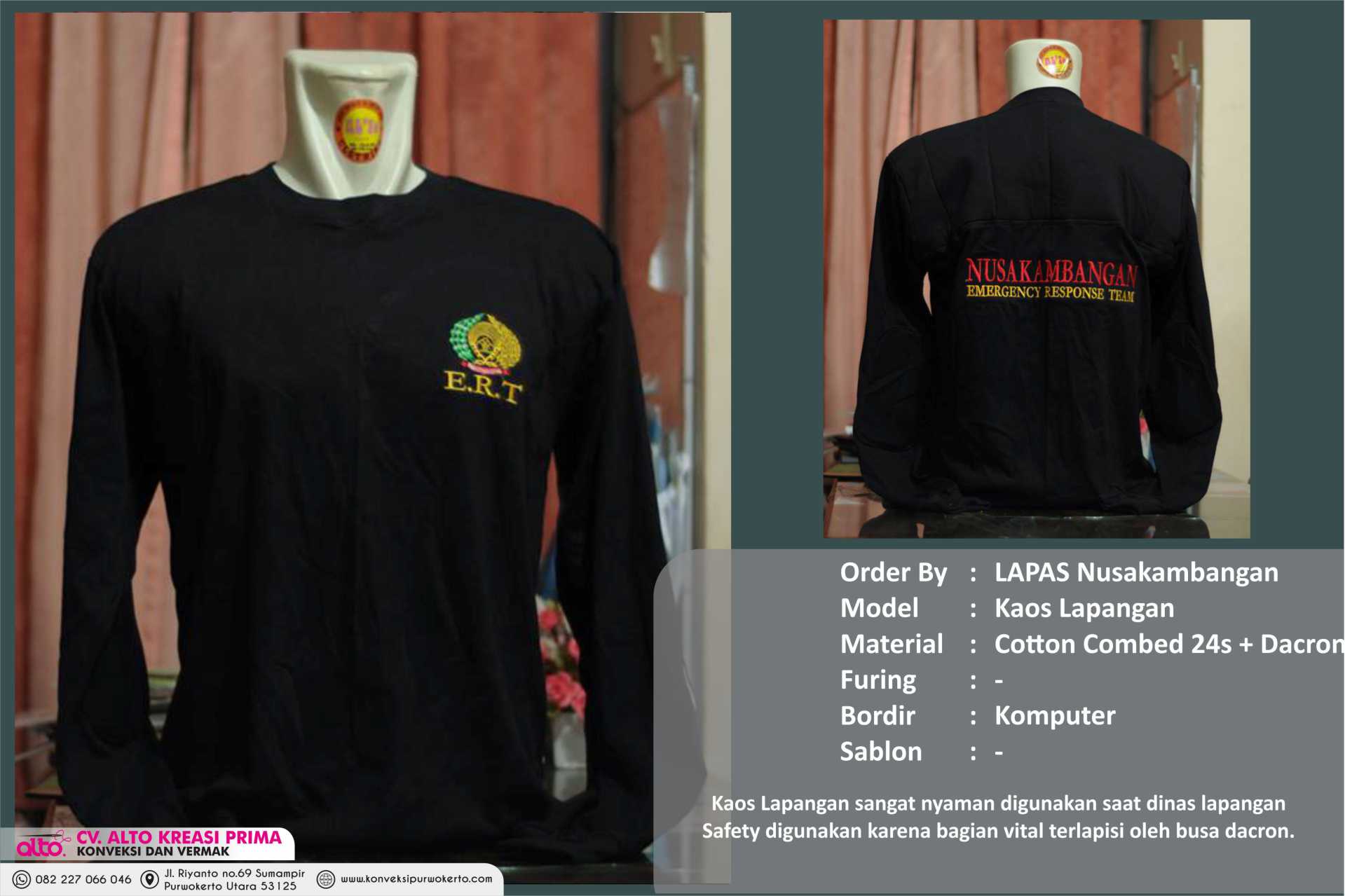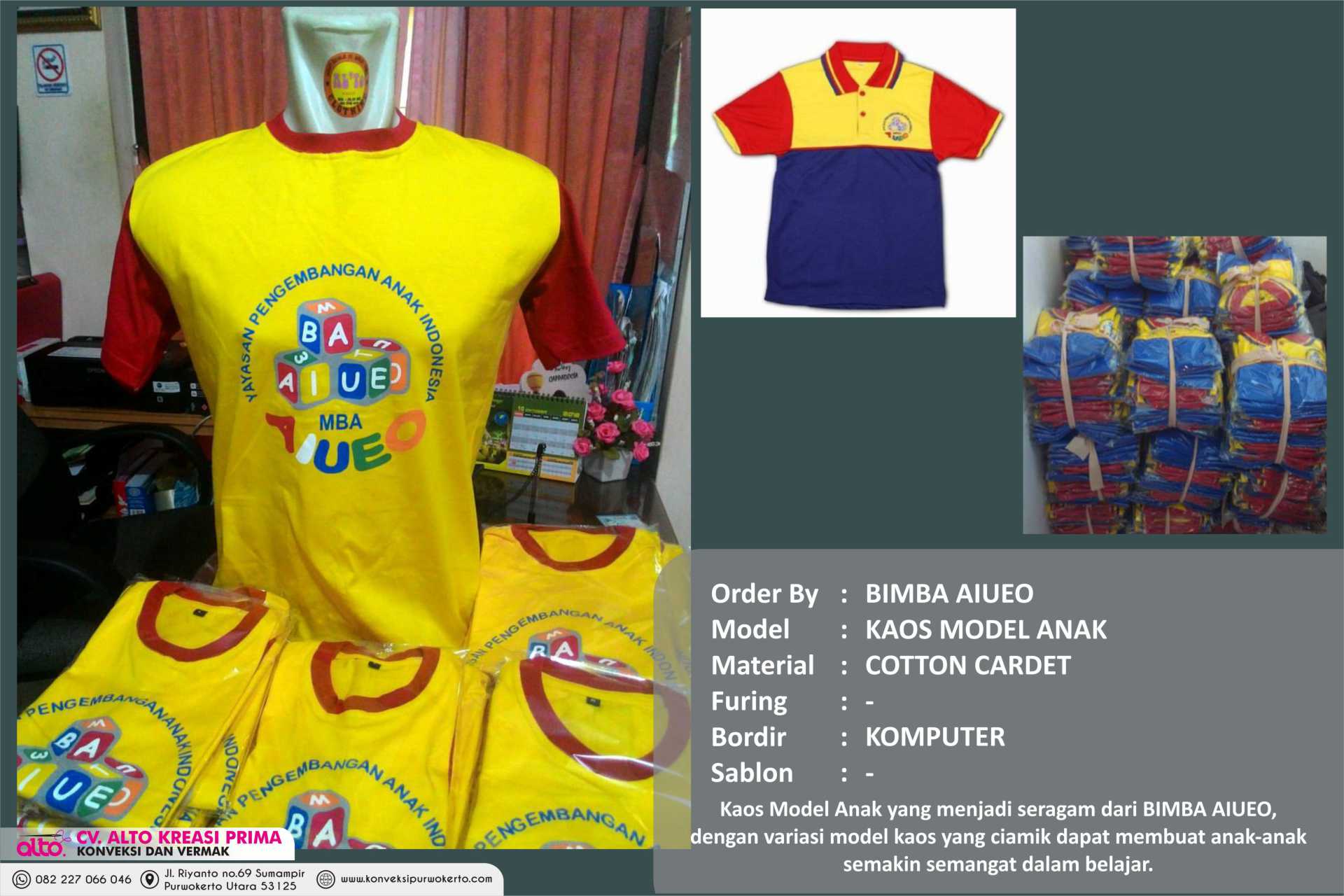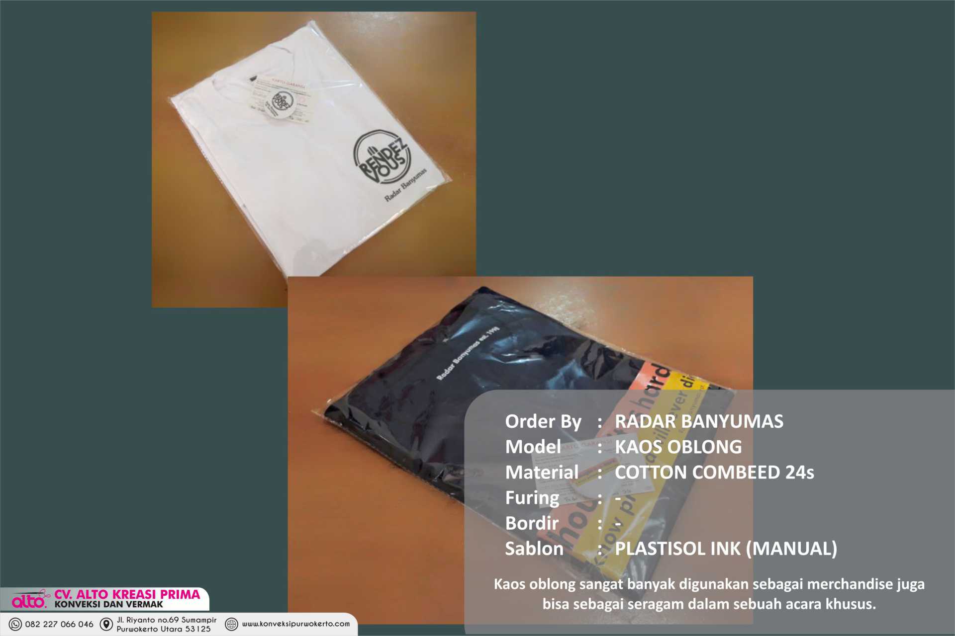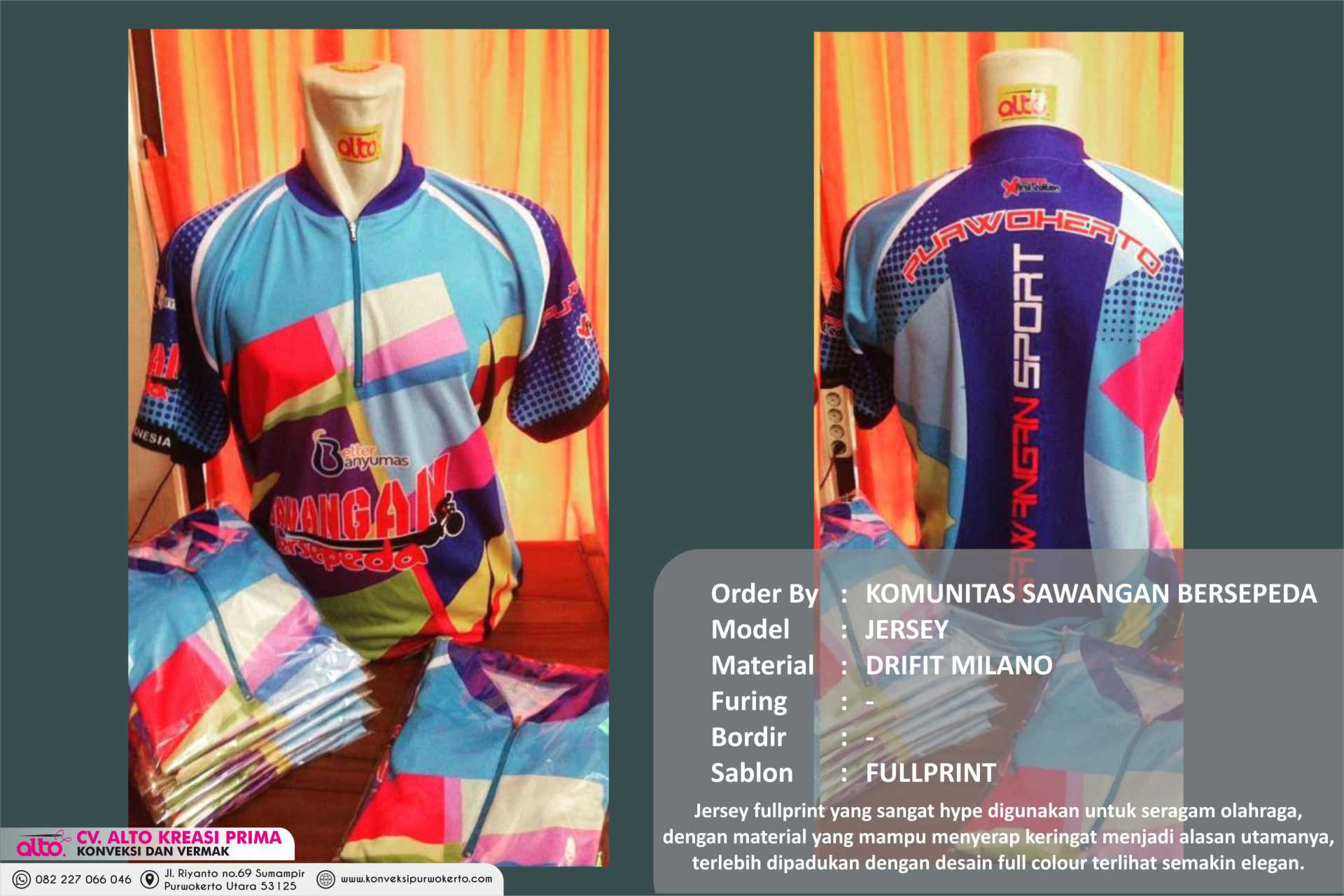 CV. ALTO KREASI PRIMA adalah perusahaan yang bergerak dibidang jasa khususnya jasa Konveksi sablon dan bordir , atas kepercayaan dari konsumen yang masih bekerjasama dengan kami seperti instansi pemerintah, perusahaan swasta, sekolah, maupun individual. Kami sangat menjaga dalam hal kualitas dan ketepatan waktu.