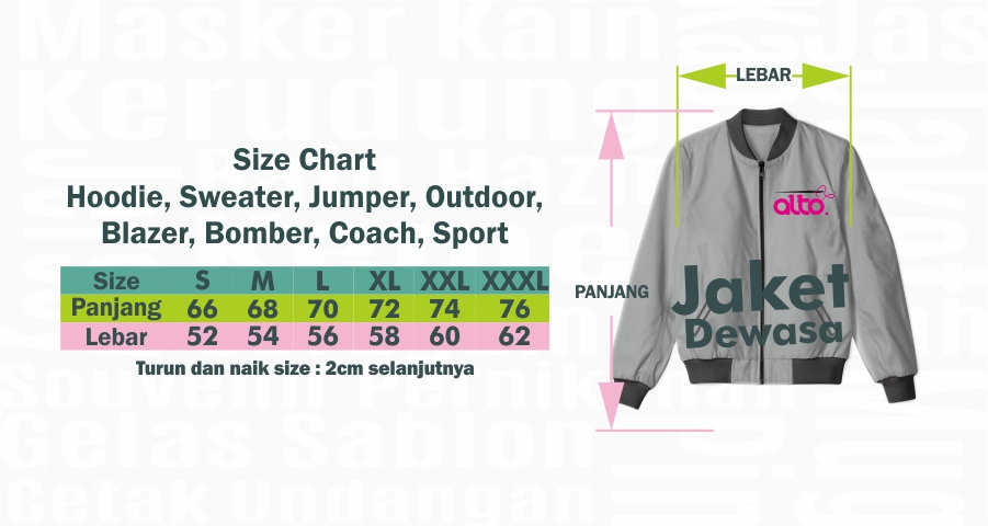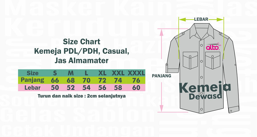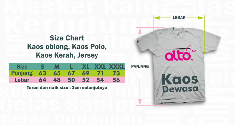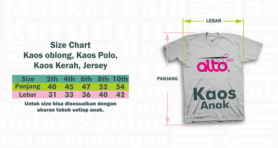 Sebagai wujud pelayanan profesional dan terbaik dari kami, guna menghindari kesalahan dalam proses produksi berikut acuan Size Chart sebagai panduan Anda dalam menentukan ukuran baju yang akan anda pesan di CV. ALTO KREASI PRIMA
